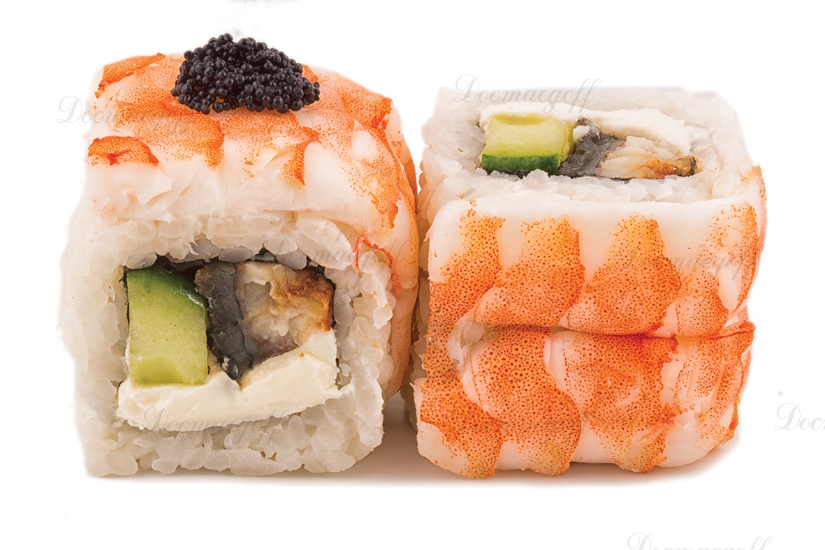 Состав: Креветки, угорь, огурец, тобико, сыр Филадельфия. 8 шт.